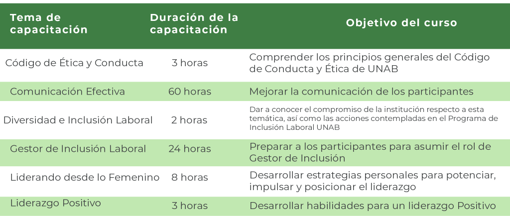Además de las herramientas descritas anteriormente, la UNAB pone a su disposición, tanto para sus funcionarios como académicos, una serie de cursos enfocados en diversas temáticas asociadas a habilidades y principios fundamentales para la institución, como bien lo es el Código de Ética y Conducta, entre otros enlistados a continuación: