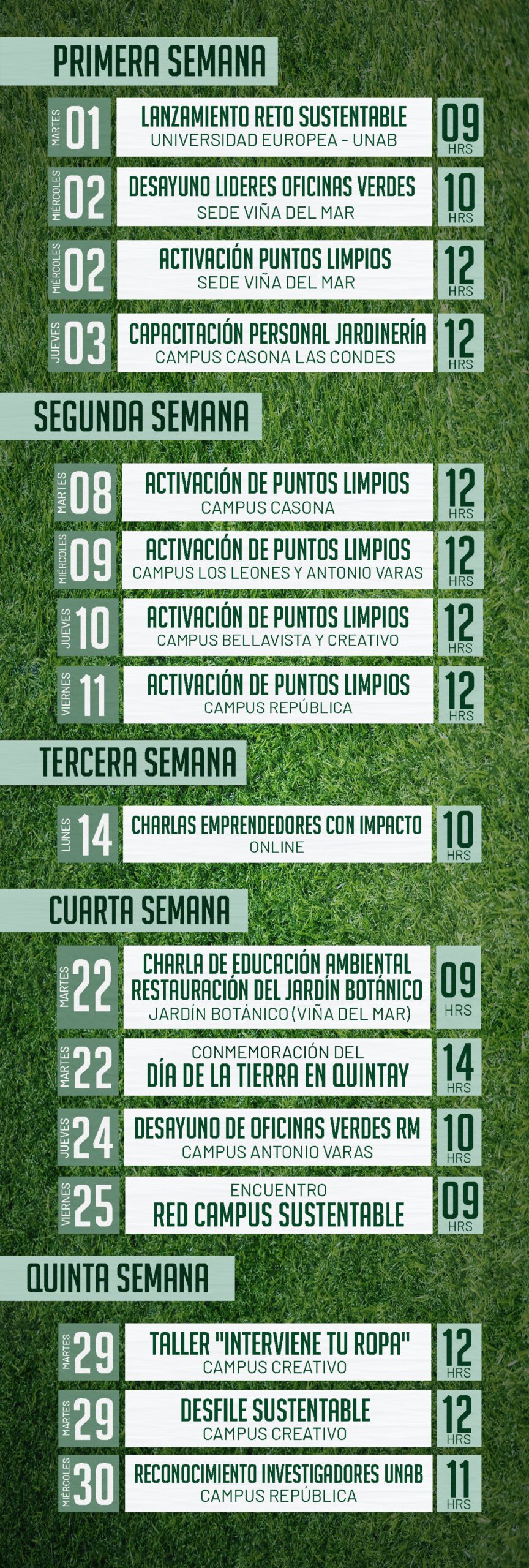 Durante todo el mes realizaremos diversas actividades en nuestros campus para promover un futuro más sostenible. Revisa todas nuestras actividades en el calendario completo. ¡Atento a nuestras redes y a las convocatorias!